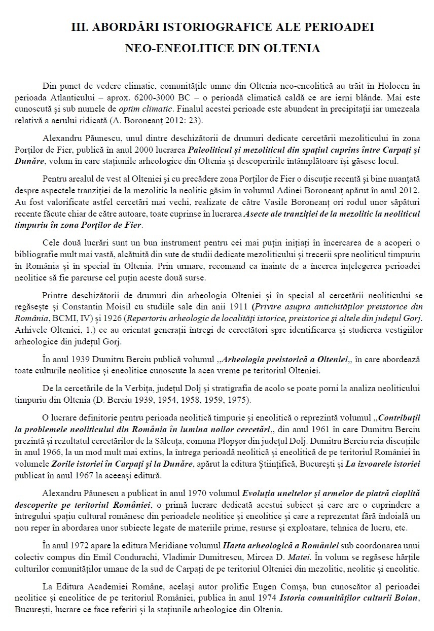 We are now in the developed period of Eneolithic cca.4600/4500 - 3800/3700 BC. The stratigraphy discovered in various sites in Oltenia that had a long existence in the Neo-Eneolithic shows that for the late Eneolithic period in this area have developed communities known as Sălcuţa. To capture more clearly their characteristic features the proposed analysis will be reported to micro zones: Eastern Oltenia and Western Walachia, Central Oltenia, Western Oltenia and Eastern Banat, and other similar issues in the neighboring territories. Chronologically, the time when Sălcuţa Culture is evolving is that of the neo glacier period (5000-2000 BC). It should also be noted that the sea level was 20m below the current one in the period before 6300 B.C., which allowed a connection between the Aegean islands and Europe as well as with Western Anatolia which facilitated the contacts between populations. Although the number of discoveries is quite consistent, systematic research has been carried out in few settlements in Oltenia: Salcuta ,,Piscul Cornișorului,, Verbicioara, Cerăt, Șimnic, Curmătura, Gârlești-Ghercești, Dolj County, Ostrovul Corbului, Almăjel, Valea Anilor, Mehedinţi County, Drăgăneşti-Olt ,,Corboaica,, Slatina ,,Strehareț,,, Brebeni, Olt County. The obtained information shall be supplemented with those from the systematic research of Banat from Baile Herculane "Peștera Hoților,,", Caraş-Severin, County.
