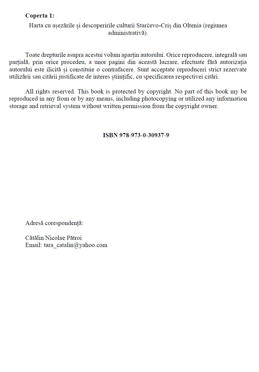 Cultura Starčevo–Criş: Com. Breznița-Ocol; Com. Burila Mare, Sat Crivina. 1; Com. Burila Mare, Sat Izvoru Frumos. 1; Com. Burila Mare, Sat Izvoru Frumos. 2; Com. Burila Mare, Sat Izvoru Frumos. 3; Com. Burila Mare, Sat. Vrancea. 1; Com. Burila Mare, Sat. Vrancea. 2; Com. Burila Mare, Sat. Vrancea. 3; Sat Căpățânești, Com. Broșteni; Com. Corlăţel, Sat Drăgaica; Com. Devesel, Sat Batoţi. 1; Com. Devesel, Sat Batoţi. 2; Com. Devesel, Sat Scăpau.1; Com. Devesel, Sat Scăpau.2; Com. Devesel, Sat Tismana; Sat Drăgaica, Com. Corlăţel; Com. Dubova. 1; Com. Dubova. 2; Com. Dubova. 3; Com. Dubova. 4; Com. Dubova. 5; Com. Dubova, Sat Plaviseviţa; Com. Eşelniţa. 1; Com. Eşelniţa. 2; Com. Eşelniţa. 3; Cartier Gura Văii, Oraş Drobeta Turnu Severin; Com. Hinova, Sat Ostrovu Corbului.1; Com. Hinova, Sat Ostrovu Corbului.2; Sat Ostrovu Mare. 1, Com. Gogoşu; Sat Ostrovu Mare. 2, Com. Gogoşu; Ostrovu Simian (insula), Com. Simian; Com. Pristol; Com Robănești, Sat Bojoiu; Com. Şimian. 1; Com. Şimian. 2; Com. Şimian. 3; Com. Şvinita. 1; Com. Şviniţa. 2; Com. Com. Şviniţa. 3; Com. Şviniţa. 4; Com. Vlădaia, Sat Almăjel; Oraş Drobeta Turnu Severin, Cartier Gura Văii. 1; Oraş Drobeta Turnu Severin, Cartier Schela Cladovei. 1; Oraş Drobeta Turnu Severin, Cartier Schela Cladovei. 2; Oraş Drobeta Turnu Severin, Cartier Schela Cladovei. 3; Oraş Drobeta Turnu Severin, Insula Ostrovu Banului. 1; Oraş Drobeta Turnu Severin, Insula Ostrovu Banului. 2; Oraș Orșova (Judeţ Mehedinţi); Com. Almăj; Sat Amărăşti, Com. Fărcaşu; Cartier Banu Mărăcine, Municipiul Craiova; Sat Basarabi, Oraş Calafat; Oraş Bechet; Com. Bistreţ; Sat Bobeanu, Com. Drăgoteşti; Sat Bojoiu, Com Robăneşti; Com. Carpen, Sat Cleanov; Sat Căciuleşti, Com. Dobreşti; Com. Cârcea. 1; Com. Cârcea. 2; Com. Cerăt; Oraş Craiova; Sat Curmătura, Com. Giurgiţa; Sat Damian, Com. Sadova; Com. Daneţi, Sat Locusteni; Com. Drăgotești. 1; Com. Ghercești; Sat Golenţi, oraş Calafat; Sat Gubaucea, Com. Vela ; Sat Padea, Com. Drănic; Sat Pârşani, Com. Pieleşti; Com. Robănești, Sat Lăcriţa Mică; Com. Sălcuţa; Com. Terpeziţa, Com. Şimnicu de Jos. 2; Com. Verbiţa; Com. Verbiţa, Sat Verbicioara. 1; Com. Verbiţa, Sat Verbicioara. 2; Oraş Calafat, Sat Basarabi;(Judeţ Dolj); Comuna Brastavăţu, Sat Cruşovu 1; Com. Brebeni; Cartier Cireaşov, Oraş Slatina; Com. Deveselu; Com. Dobrosloveni; Sat Frăsinet, Com. Vlădila; Com. Grădinile. 1; Com.Gradinile.2; Com. Ipoteşti; Com. Mărunţei, Sat Comani; Com. Milcov, Sat Stejaru. 1; Com. Studina 1; Com. Studina 2; Sat Ulmii; Com. Verguleasa; Sat Vădastra, Comuna Vădastra; Oraș Drăgănești–Olt; Oraş Slatina; Oraş Slatina, Sat Sărăcesti;(Judeţ Olt); Sat Boroșteni, Com. Peştişani; (Judeţ Gorj); Com. Bujoreni; Oraş Drăgăşani; Com. Mihăeşti, Sat Negreni; Com. Mihăeşti, Sat Govora. 1; Com. Mihăeşti, Sat Govora 2; Com. Mihăeşti, Sat Stupăreni; Sat Olteni, Com. Bujoreni; Com. Scundu; Oraş Râmnicu Vâlcea, 1; Oraş Râmnicu Vâlcea, 2; Oraş Râmnicu Vâlcea, 3; (Judeţ Vâlcea).